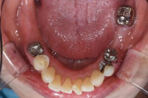 画面向かって左下に2本のインプラントを埋入しました。処置時間は30分程度です。この患者様は術後、痛みやトラブルもなく、現在は治療終了しており、満足に食事ができるようになった、有難うございましたとのお言葉をかけて下さいました(*^-^*)