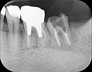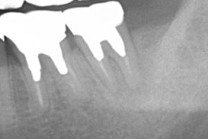 歯の根が虫歯になり、化膿していました。一般的に、一度神経を除去した歯の再治療で、化膿するまで状態が悪化すると、治療後の成功率(治癒率)が悪くなると、いろんなデータが出ています。