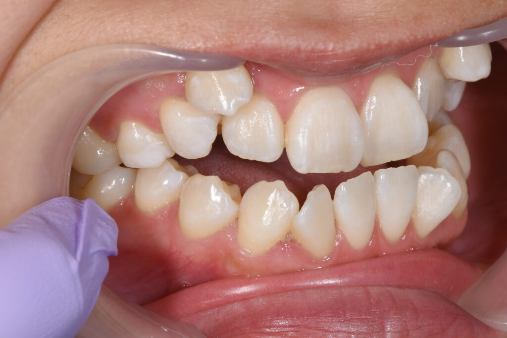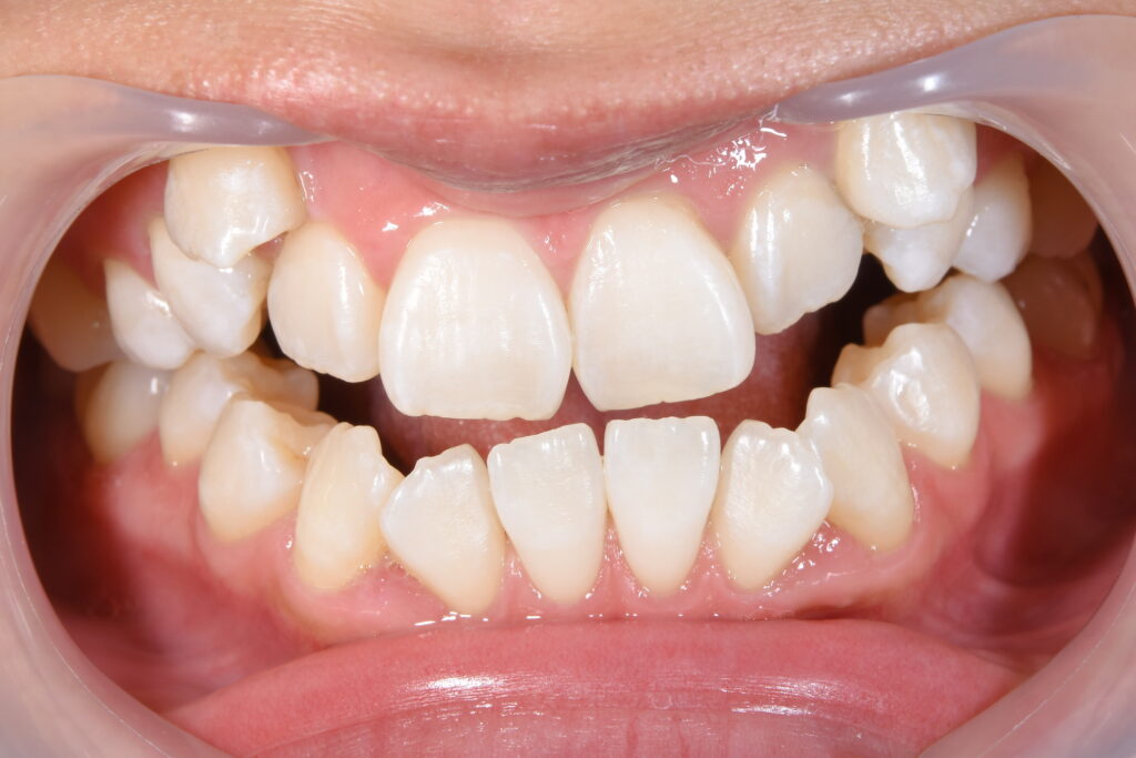 ①叢生(歯のがたつき)→清掃性が悪く将来虫歯・歯周病リスクが高くなる